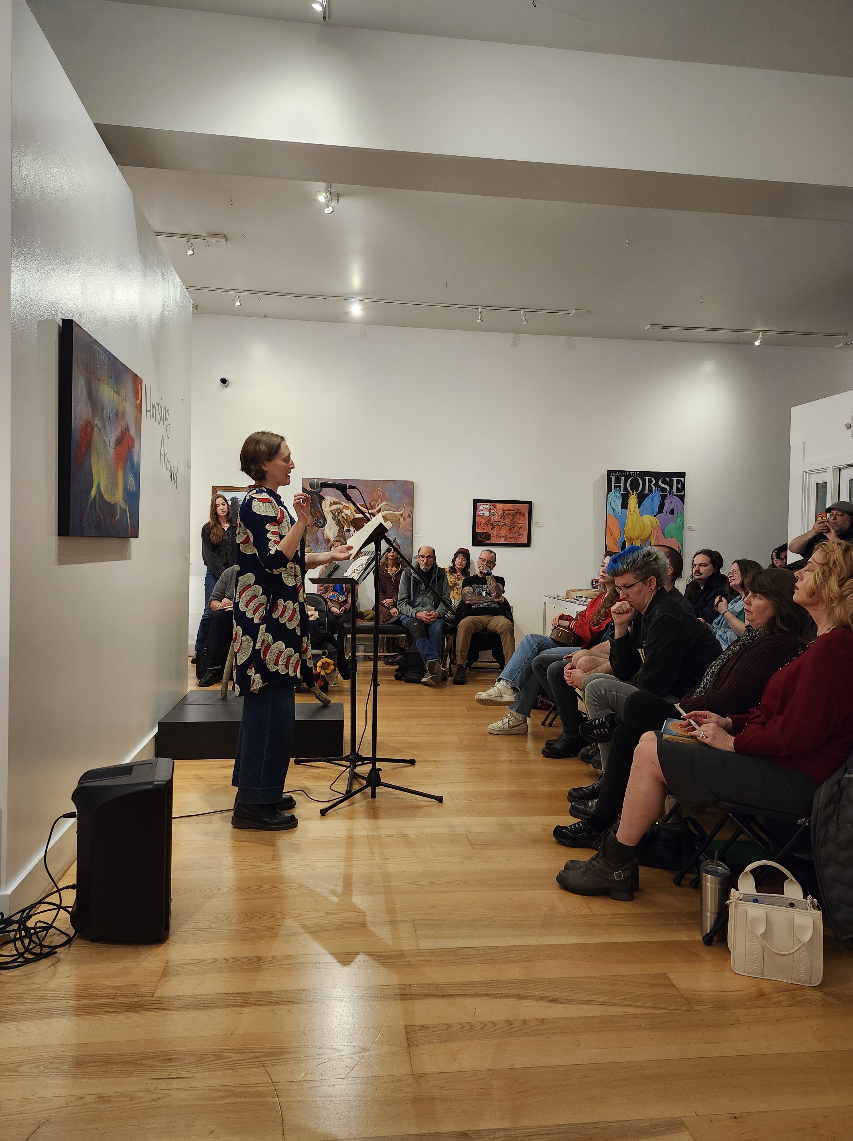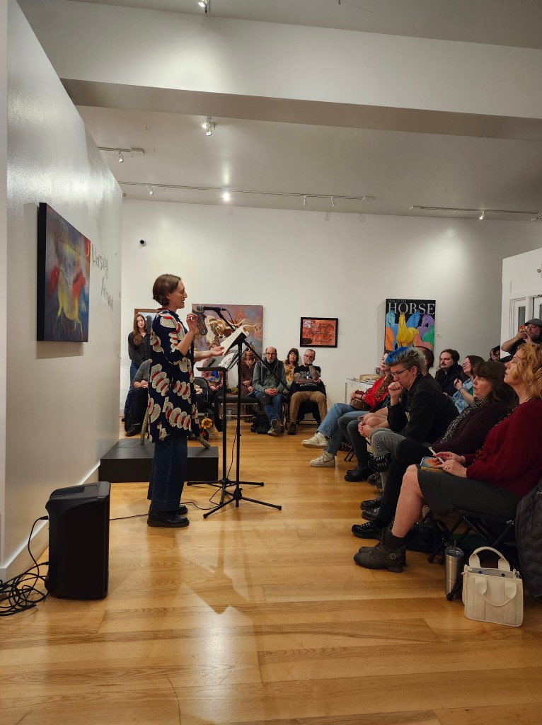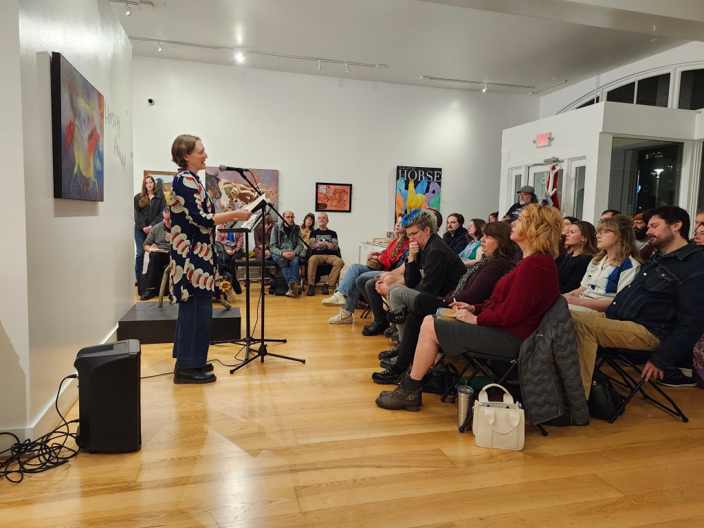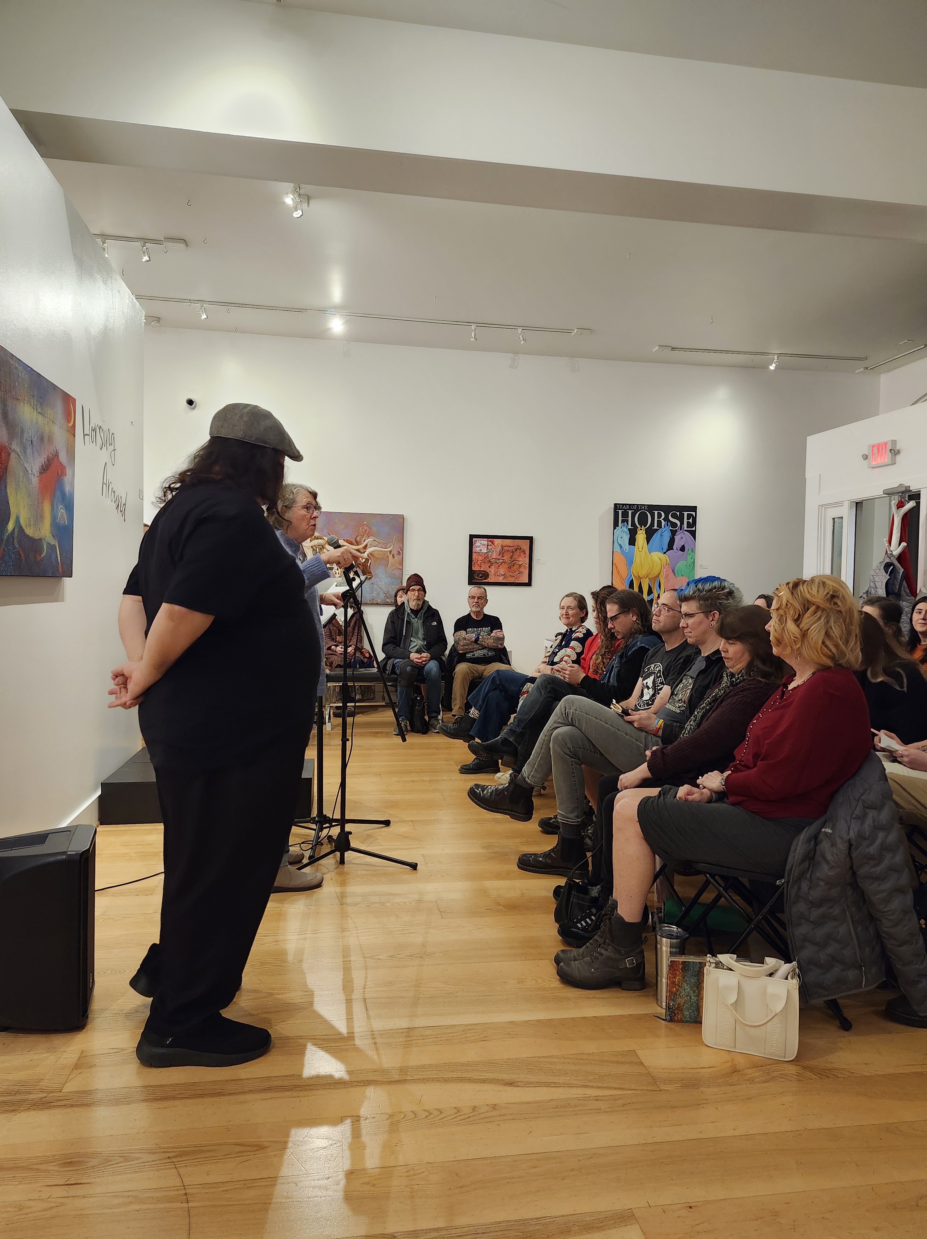 Laura Esther Sciortino shares her work with the crowd at Art At the Cave, which was in-between shows.