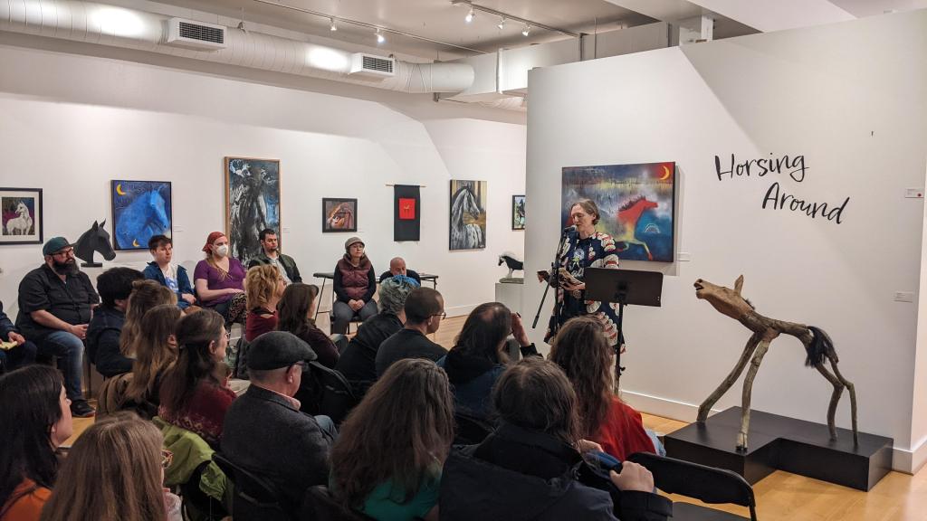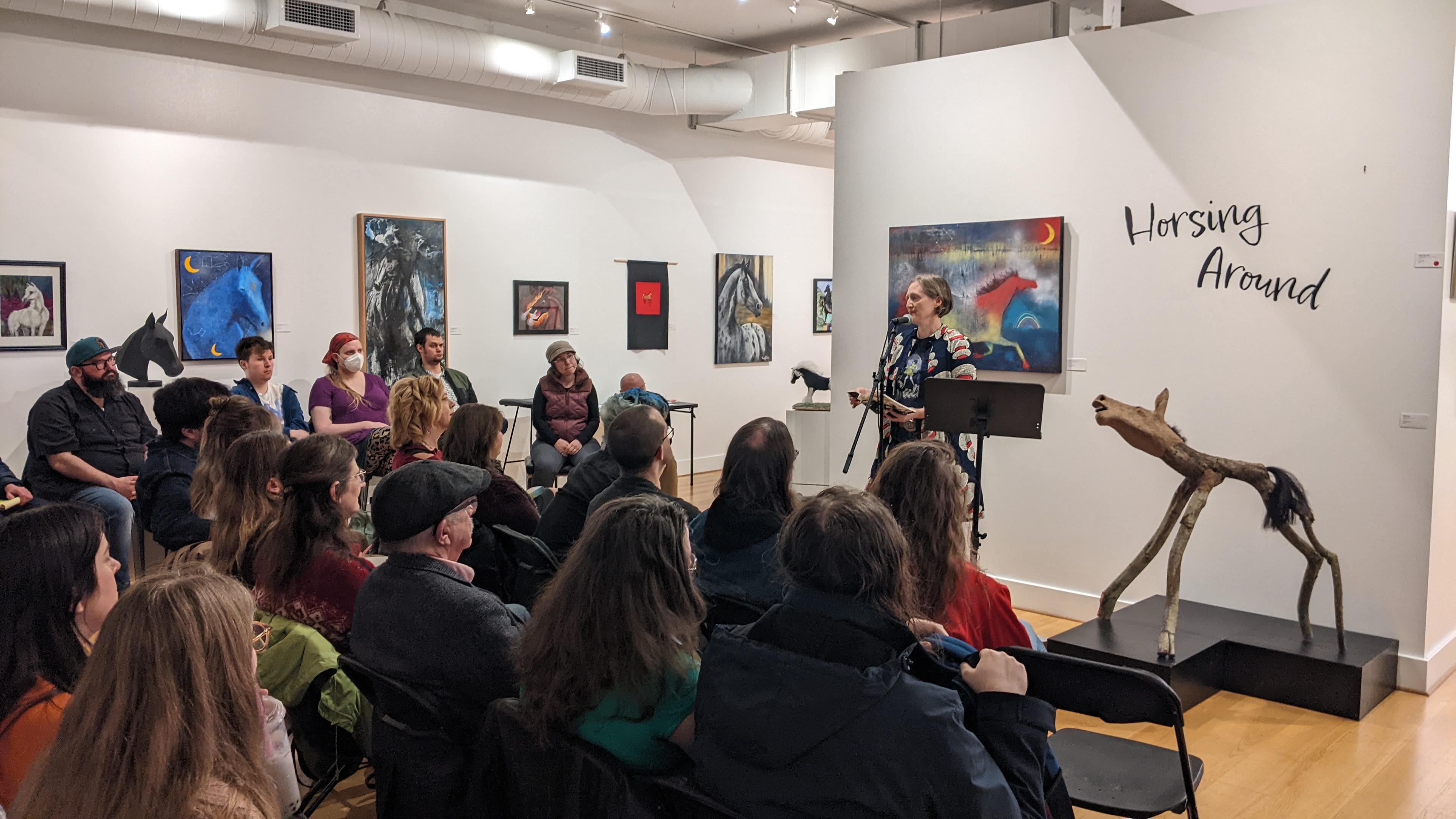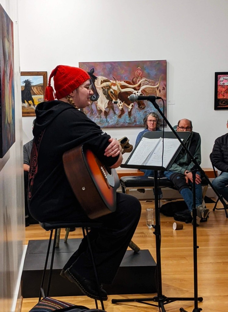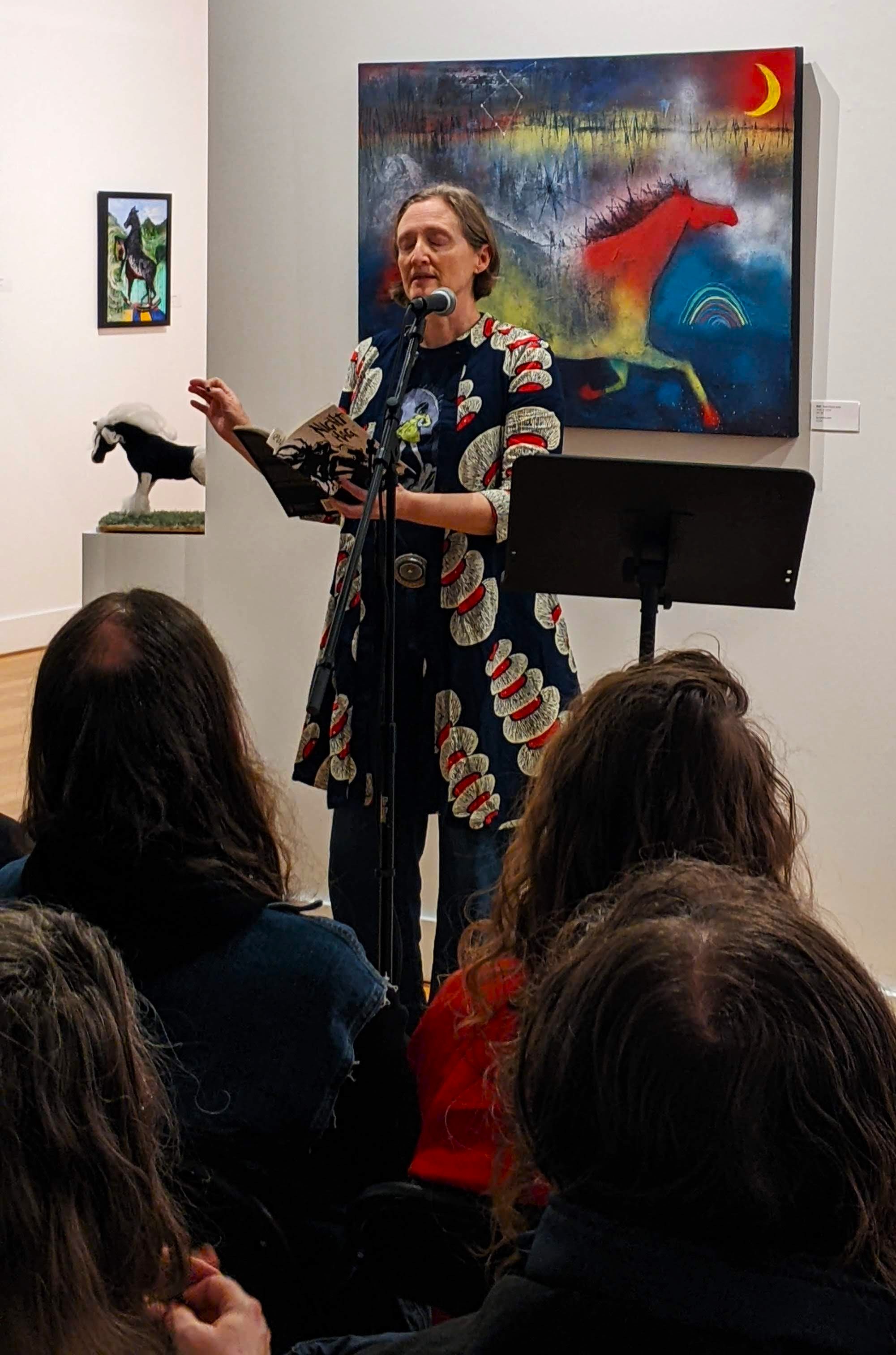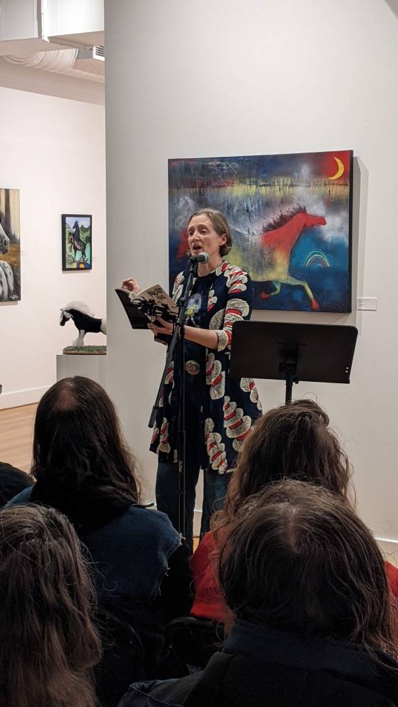 Laura Esther Sciortino shares her work with the crowd at Art At the Cave, which was in-between shows.