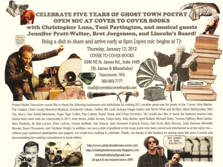 “My most sincere thanks to Christopher Luna and Toni Partington for hosting the Ghost Town Poetry Open Mic, and to Mel Sanders of Cover to Cover Books & Espresso for housing this collection of written word dreamers, observers, movers and shakers. I also want to thank the Ghost Town Poetry community and the Vancouver Arts community for their encouragement and support, for what I hope will be a successful, multi-faceted career in the arts. ”