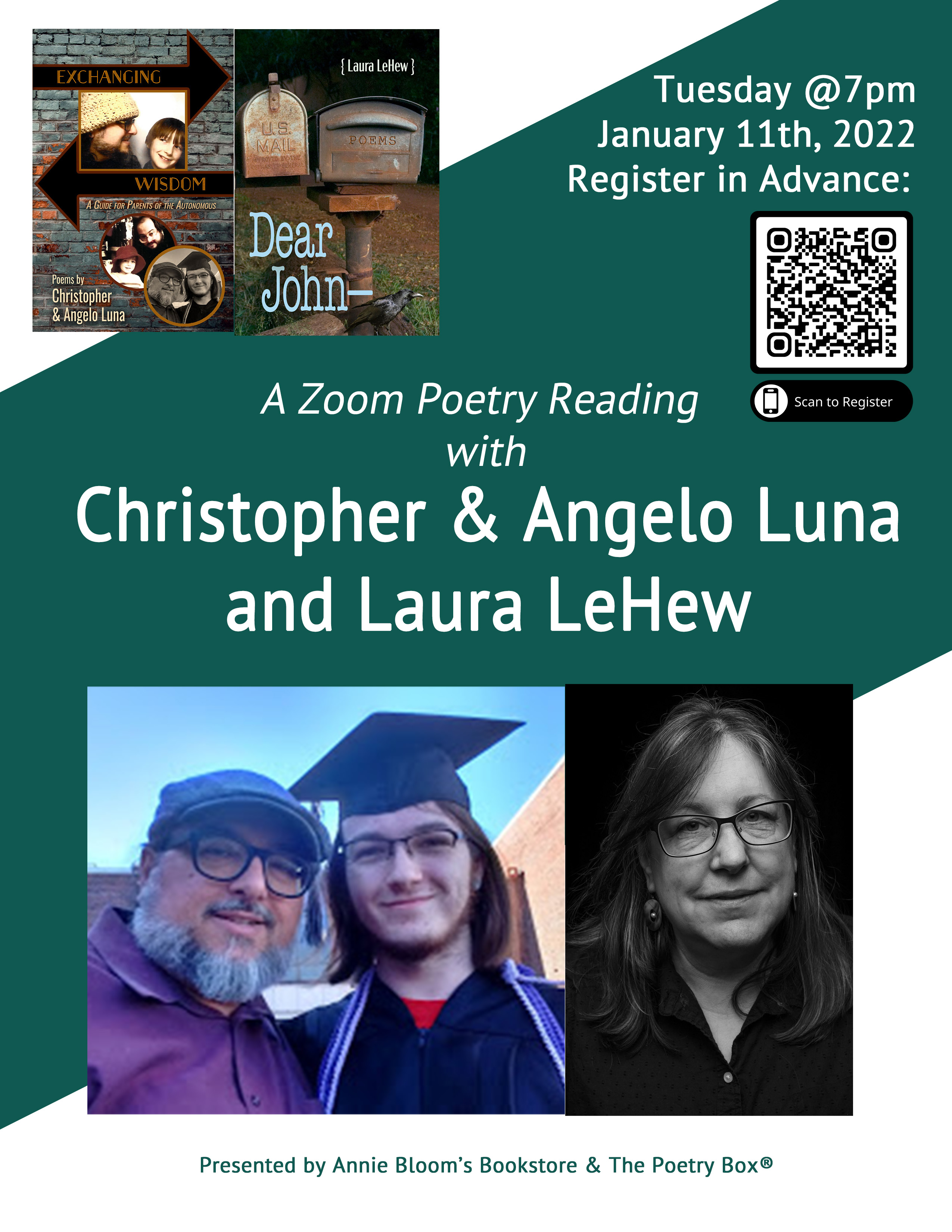 Annie Bloom’s welcomes local poets Christopher Luna, Angelo Luna, and Laura Lehew for a livestream reading from their new collections from Portland press The Poetry Box.
