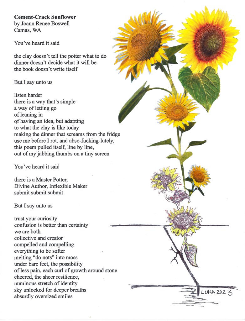 The Ghost Town Poetry community respectfully encourages you to support Niche Wine Bar, whose owner, Leah Jackson, provided a home for the reading series from 2015-2020. Stop by their new location at 900 Washington, Suite 130 Vancouver, WA 98660: https://nichewinebar.com. UPDATED Statement on Healthy Spaces from Art at the Cave: We want to provide a healthy space to enjoy art. We have been practicing safety precautions such as regular cleaning, social distancing and mask wearing. As a result of the removal of the mask mandate effective March 12, 2022, we will no longer require the wearing of masks. We encourage you to continue to wear a mask if it makes you feel more comfortable, and we will supply masks and hand sanitizer at the door. As social distancing has become a norm, please be mindful some will still need a bit of personal space while inside the gallery.