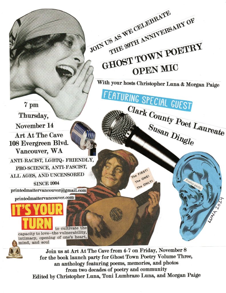 Send an email to printedmattervancouver@gmail.com to receive The Work, Christopher Luna’s monthly newsletter featuring news and events for poets in Vancouver, WA, Portland, OR and surrounding areas.