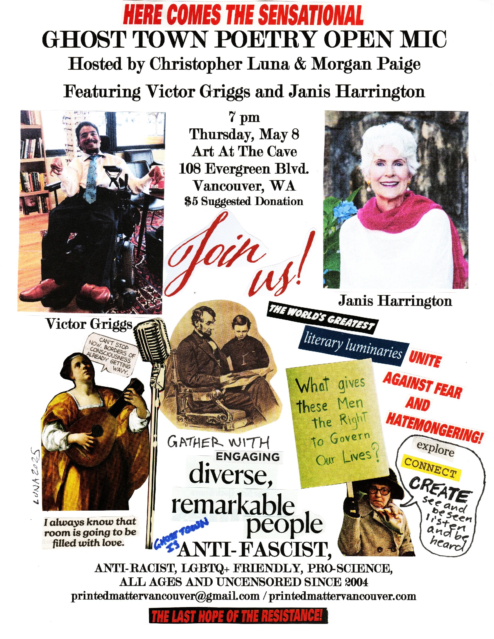 Donations can be made in person or through Christopher Luna’s PayPal account (christopherjluna@gmail.com). Include a memo stating that the money is for Ghost Town Poetry.