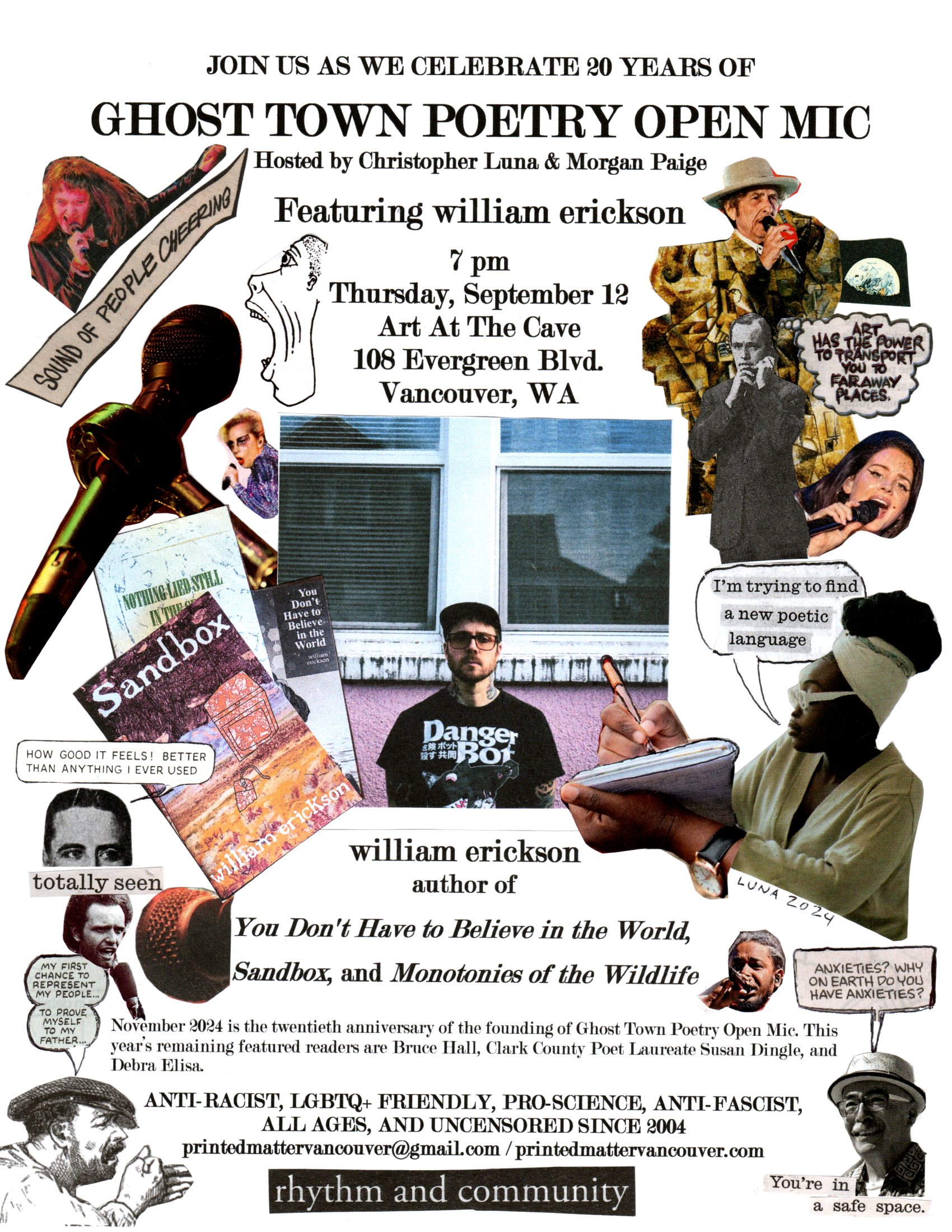 Finally, a big thank you to everyone who has attended Ghost Town Poetry Open Mic over the past two decades. We could not have enjoyed our raucous, three-hour, anti-racist, anti-fascist, pro-science, LGBTQ+ friendly, all ages, and uncensored poetry reading without your consistent embodiment of those principles and your willingness to hold the space for everyone who was brave enough to step to the mic.