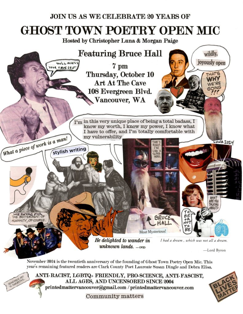 November 2024 is the twentieth anniversary of the founding of Ghost Town Poetry Open Mic. This year’s remaining featured readers will include Bruce Hall, Clark County Poet Laureate Susan Dingle and Debra Elisa.