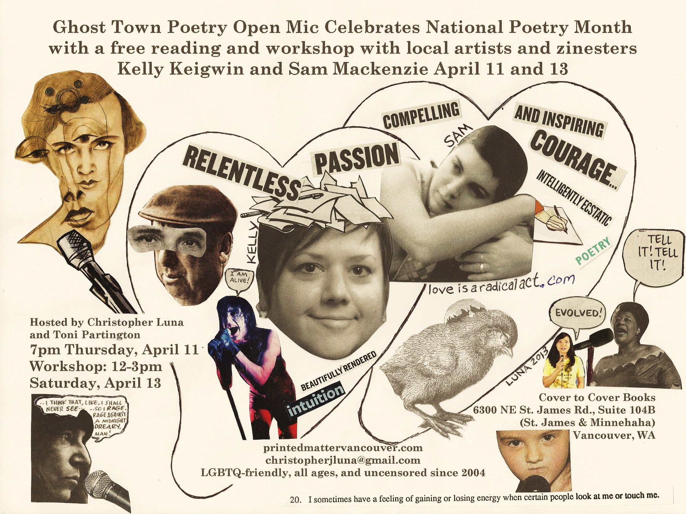 Poets Christopher Luna and Toni Partington are the co-hosts of the popular Ghost Town Poetry Open Mic and co-founders of Printed Matter Vancouver, a local small press and editing service. Their visual art has appeared in Angst Gallery, North Bank Artists Gallery, Gallery 360, Art in the Heart, Multnomah Arts Center, and the Vancouver Community Library.