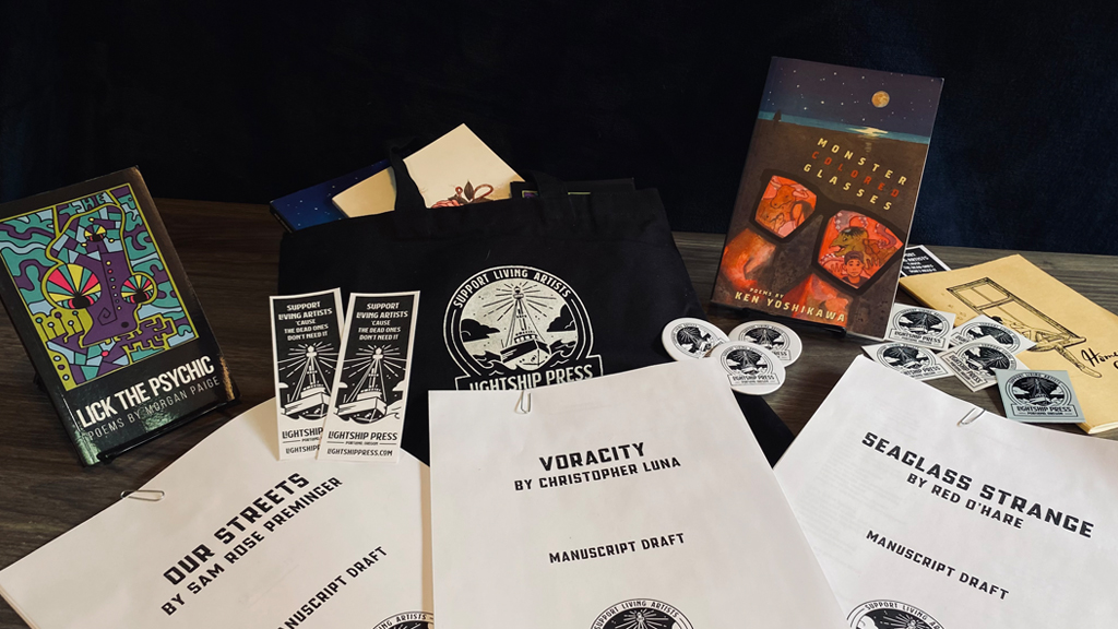 Igor Brezhnev and Sam Rose Preminger founded Lightship Press “to support living artists with an emphasis on poetry (as this is our field of expertise). This mission will be realized through publishing and promoting high-quality full-length books and chapbooks, recording spoken word performances, and producing community events where contributors can step into the public eye and market their work. Priority, both in who we publish and who we hire onto our team, will be given to authors intending to earn a portion of their income through their literary craft. Our motto is ‘Support Living Artists Cause the Dead Ones Don’t Need It.'”